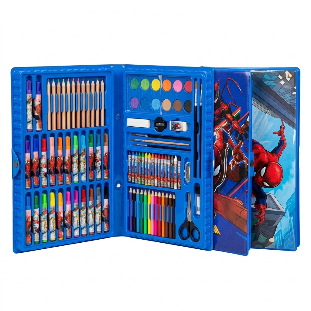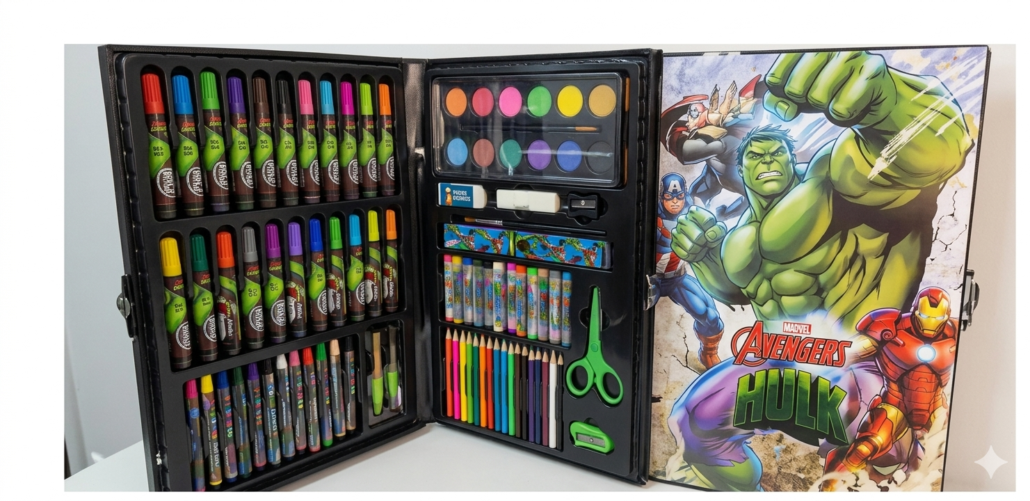 AVERGERS KIT DE ARTE DE 86 PIEZAS * 24 marcadores * 24 crayones * 12 colores * 12 acuarelas * Regla 15cm * Borador / sacapunta / pegamento / tijeras / abrochadora / pincel / lapiz / clips /