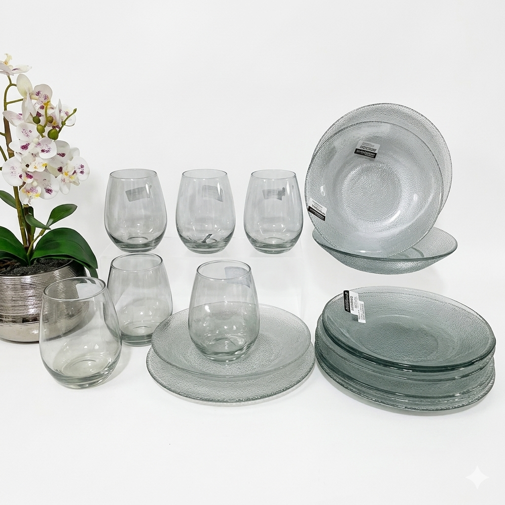 El set incluye: 6 Platos Playos y 6 Platos Hondos – Material: vidrio transparente – Medidas: Diámetro 21 cm (playo) Diámetro 19 cm (hondo) 6 VASOS COPÓN GOURMET – Material: vidrio transparente – Medidas: altura 12 cm/ diámetro de boca 6,5 cm – Capacidad: 450 ml