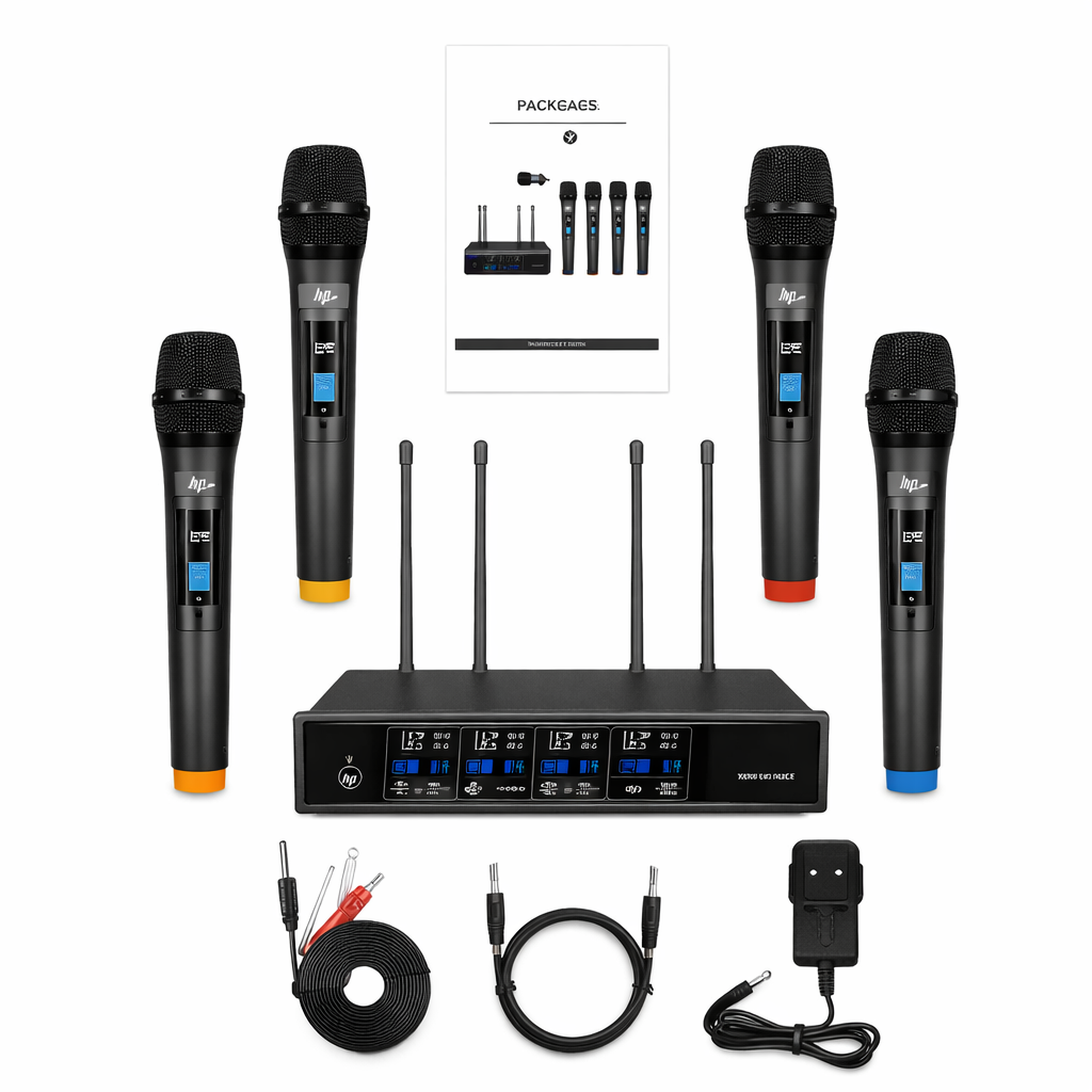 * Funcionamiento Inalámbrico: Transmisor de banda UHF * Tipo de Micrófono: Dinámico * Alcance Inalámbrico: Hasta 150 metros * Estabilidad de Frecuencia: 95dB * Respuesta de Frecuencia: 50Hz – 18kHz * Alimentación del micrófono: 2 pilas AA (no incluidas) * Fuente de Alimentación: 120/240V Se entrega con: 1x Receptor 4x Micrófonos Inalámbricos 1x Cable RCA a 3.5 mm 1x Cable de Audio 6.3 mm 1x Cable USB de carga 1x Manual de Usuario