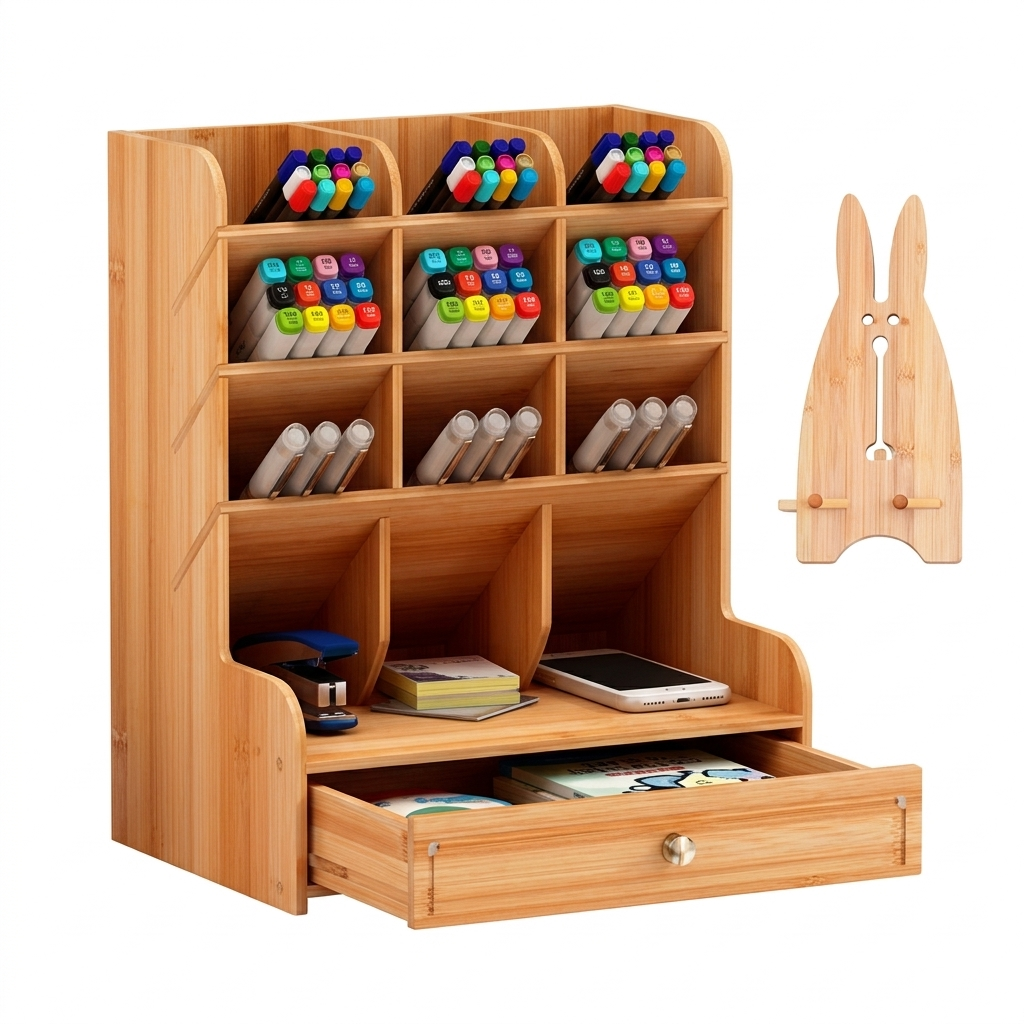 * Material: Madera Ecológica * Dimensiones: 25,5 x 15 x 21 cm * Con Cajonera: Sí * Incluye Soporte para celular * Cantidad de compartimentos: 12 Se entrega con: * 1 x Organizador de escritorio * 1 x Soporte para celular de escritorio