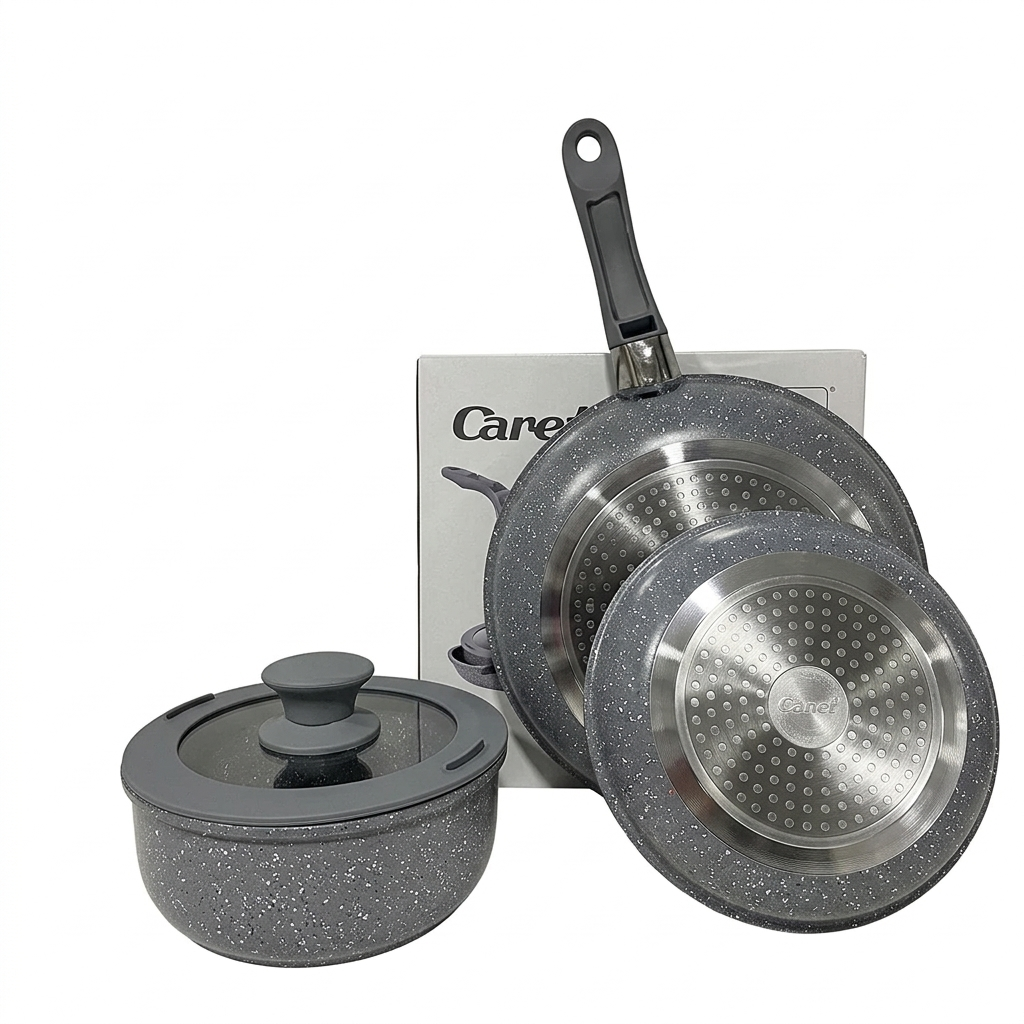 68005GGR GRIS Incluye 5 PIEZAS * Cacerola 18cm con tapa * Sartén 20cm * Sartén 26cm * Mango extraíble -Excelente conductividad térmica -Apto para distintos tipos de cocina: Inducción, cerámico, eléctrico, gas, halógeno -3 Capas antiadherente -Aluminio Fundido -Apto para horno -Ocupa menos espacio, facil de apilar y guardar