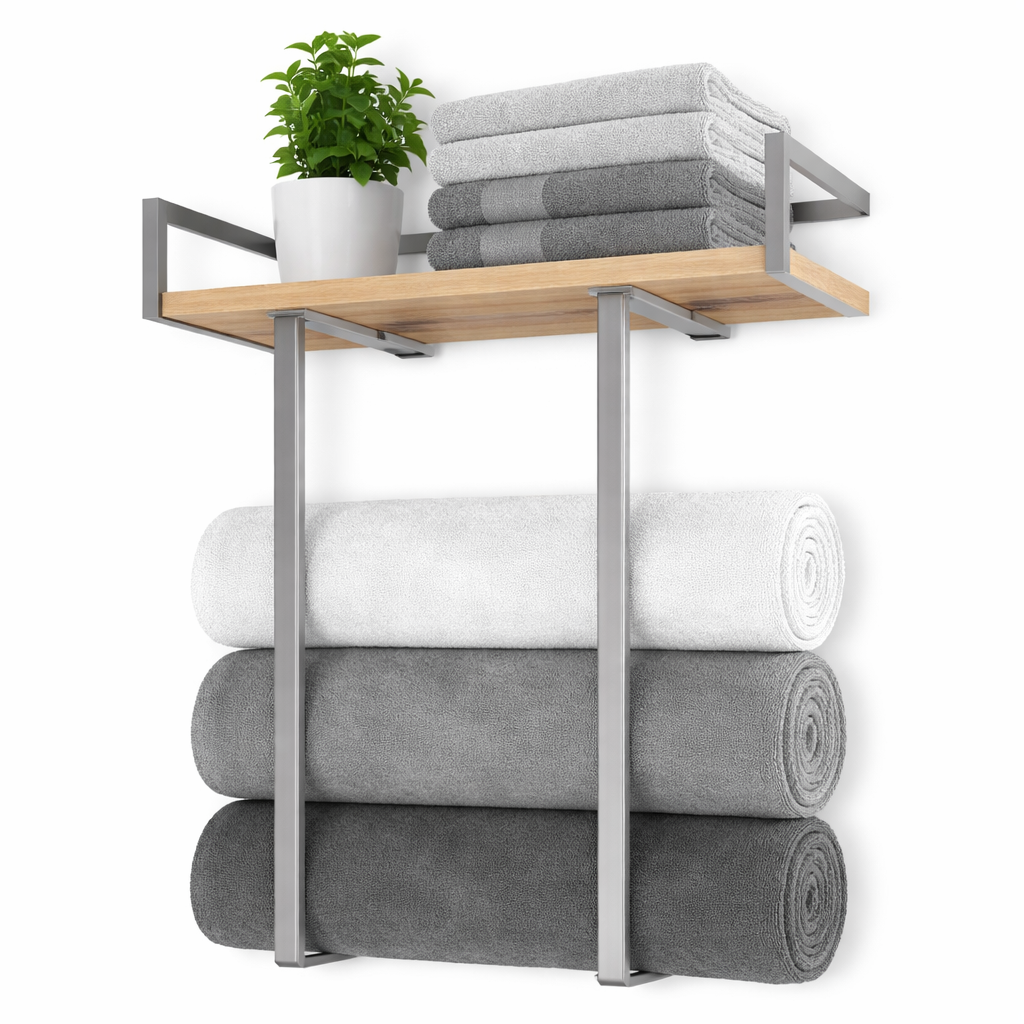 COLORES PLATEADO * Tipo de producto: Colgador de pared con estante * Uso: Baño, cocina, lavadero o entrada * Materiales: Hierro + madera de pino natural * Terminación del metal: Pintura electrostática anti-óxido * Diseño del estante: Reversible con tres configuraciones (Outward / Inward / Sin laterales) * Montaje: A pared, con tornillos * Orificios preperforados: Sí (4) * Capacidad de carga: Hasta 18 kg * Formato de entrega: Desarmado * Requiere armado: Sí, sencillo * Accesorios incluidos: To…